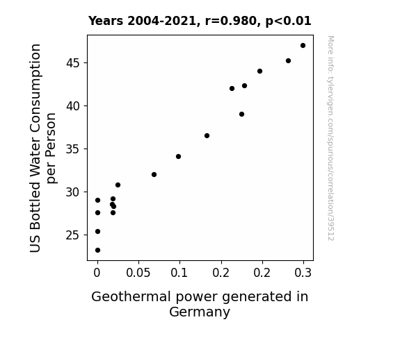 This means 96% of the change in the one variable (i.e., Geothermal power generated in Germany) is predictable based on the change in the other (i.e., US Bottled Water Consumption per Person) over the 18 years from 2004 through 2021.