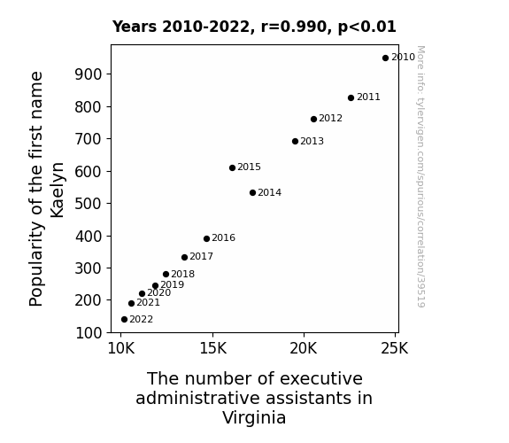 This means 98% of the change in the one variable (i.e., The number of executive administrative assistants in Virginia) is predictable based on the change in the other (i.e., Popularity of the first name Kaelyn) over the 13 years from 2010 through 2022.