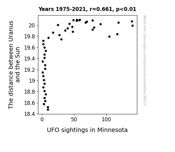 This means 43.7% of the change in the one variable (i.e., UFO sightings in Minnesota) is predictable based on the change in the other (i.e., The distance between Uranus and the Sun) over the 47 years from 1975 through 2021.
