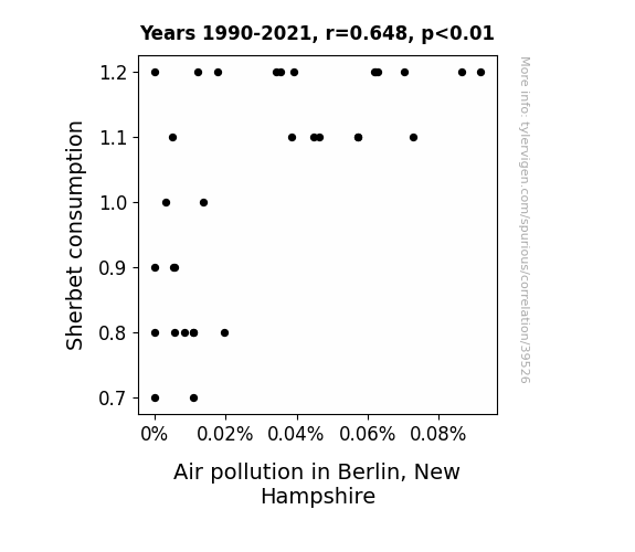 This means 42% of the change in the one variable (i.e., Air pollution in Berlin, New Hampshire) is predictable based on the change in the other (i.e., Sherbet consumption) over the 32 years from 1990 through 2021.