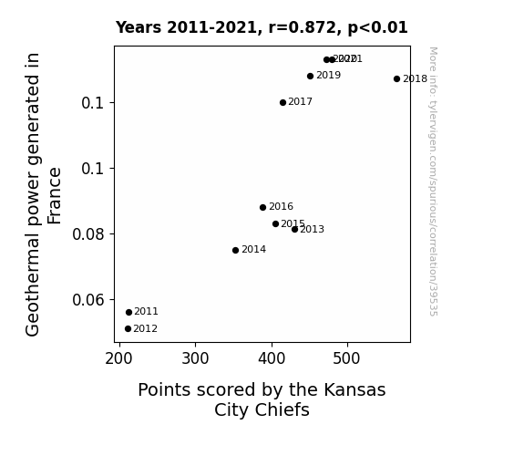 This means 76% of the change in the one variable (i.e., Points scored by the Kansas City Chiefs) is predictable based on the change in the other (i.e., Geothermal power generated in France) over the 11 years from 2011 through 2021.