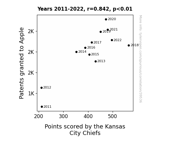 This means 71% of the change in the one variable (i.e., Points scored by the Kansas City Chiefs) is predictable based on the change in the other (i.e., Patents granted to Apple) over the 12 years from 2011 through 2022.
