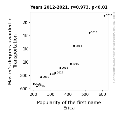 This means 94.7% of the change in the one variable (i.e., Popularity of the first name Erica) is predictable based on the change in the other (i.e., Master's degrees awarded in Transportation) over the 10 years from 2012 through 2021.