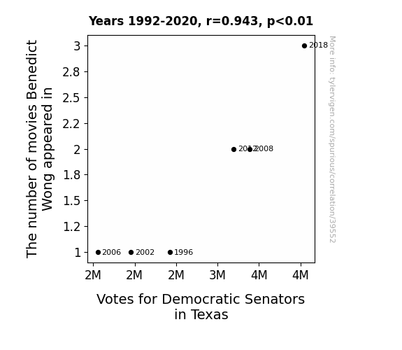 This means 88.9% of the change in the one variable (i.e., Votes for Democratic Senators in Texas) is predictable based on the change in the other (i.e., The number of movies Benedict Wong appeared in) over the 6 years from 1992 through 2020.