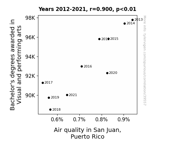 This means 80.9% of the change in the one variable (i.e., Air quality in San Juan, Puerto Rico) is predictable based on the change in the other (i.e., Bachelor's degrees awarded in Visual and performing arts) over the 10 years from 2012 through 2021.