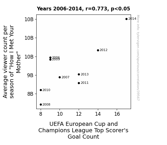 This means 59.8% of the change in the one variable (i.e., UEFA European Cup and Champions League Top Scorer's Goal Count) is predictable based on the change in the other (i.e., Average viewer count per season of "How I Met Your Mother") over the 9 years from 2006 through 2014.
