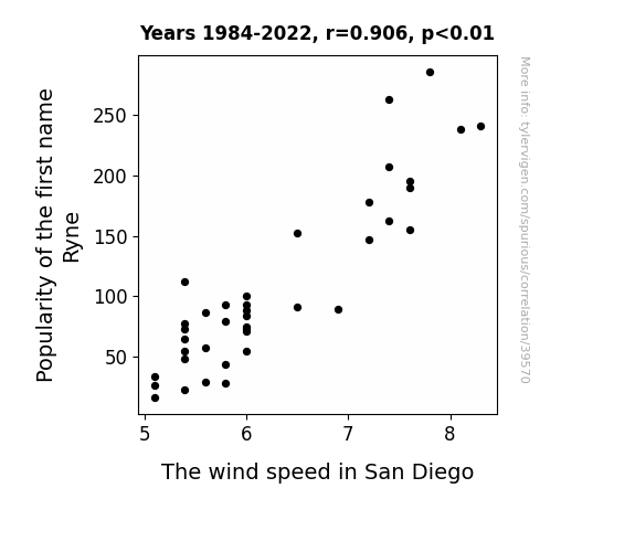 This means 82.1% of the change in the one variable (i.e., The wind speed in San Diego) is predictable based on the change in the other (i.e., Popularity of the first name Ryne) over the 39 years from 1984 through 2022.