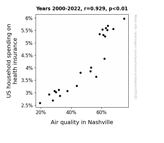 This means 86.3% of the change in the one variable (i.e., Air quality in Nashville) is predictable based on the change in the other (i.e., US household spending on health insurance) over the 23 years from 2000 through 2022.