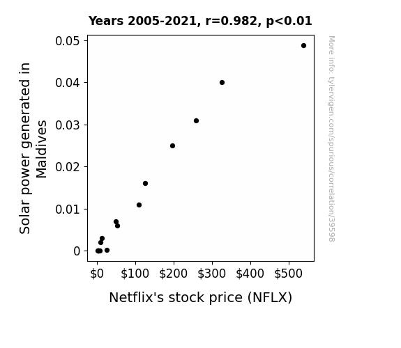 This means 96.3% of the change in the one variable (i.e., Netflix's stock price (NFLX)) is predictable based on the change in the other (i.e., Solar power generated in Maldives) over the 17 years from 2005 through 2021.
