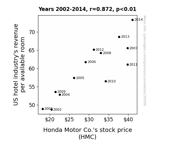 This means 76% of the change in the one variable (i.e., Honda Motor Co.'s stock price (HMC)) is predictable based on the change in the other (i.e., US hotel industry's revenue per available room) over the 13 years from 2002 through 2014.