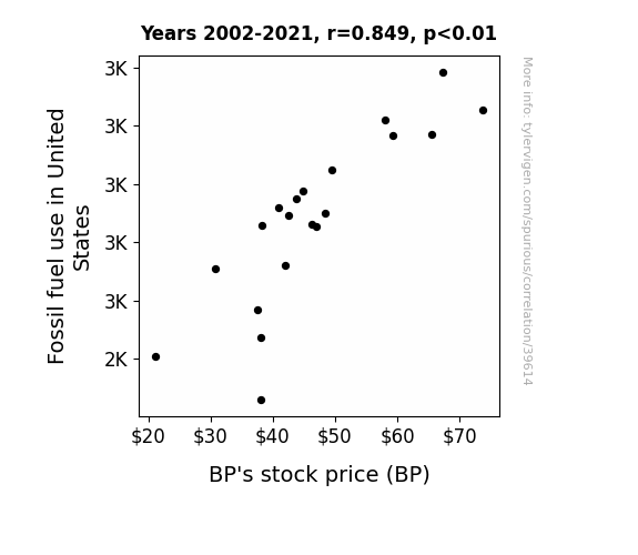 This means 72.1% of the change in the one variable (i.e., BP's stock price (BP)) is predictable based on the change in the other (i.e., Fossil fuel use in United States) over the 20 years from 2002 through 2021.