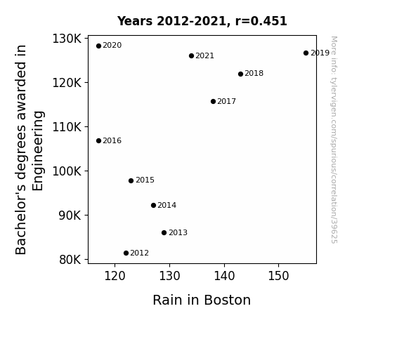 This means 20.4% of the change in the one variable (i.e., Rain in Boston) is predictable based on the change in the other (i.e., Bachelor's degrees awarded in Engineering) over the 10 years from 2012 through 2021.