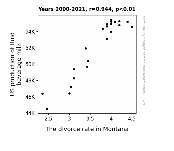 This means 89.1% of the change in the one variable (i.e., The divorce rate in Montana) is predictable based on the change in the other (i.e., US production of fluid beverage milk) over the 22 years from 2000 through 2021.