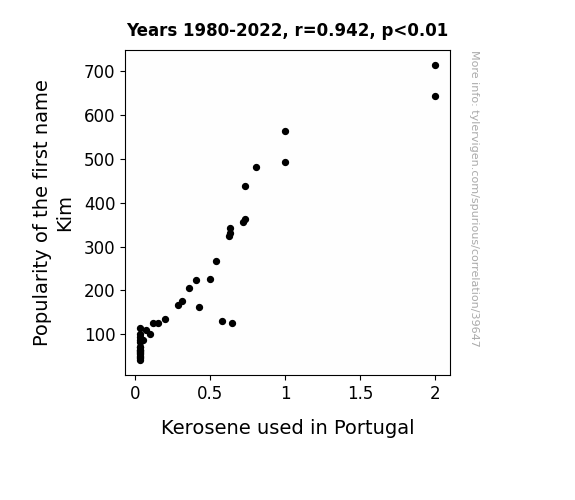 This means 88.7% of the change in the one variable (i.e., Kerosene used in Portugal) is predictable based on the change in the other (i.e., Popularity of the first name Kim) over the 43 years from 1980 through 2022.