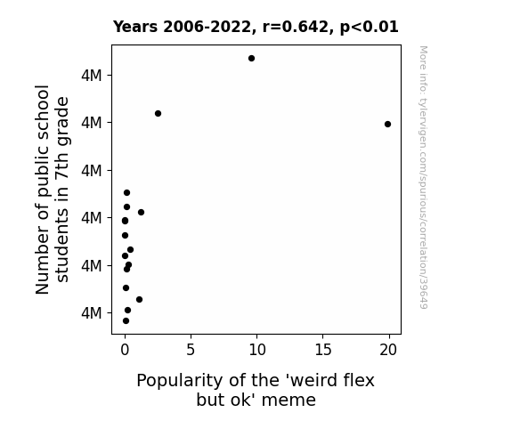 This means 41.2% of the change in the one variable (i.e., Popularity of the 'weird flex but ok' meme) is predictable based on the change in the other (i.e., Number of public school students in 7th grade) over the 17 years from 2006 through 2022.