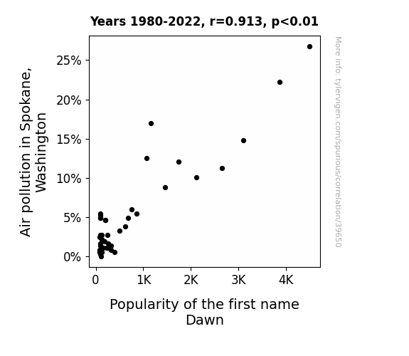 This means 83.4% of the change in the one variable (i.e., Popularity of the first name Dawn) is predictable based on the change in the other (i.e., Air pollution in Spokane, Washington) over the 43 years from 1980 through 2022.