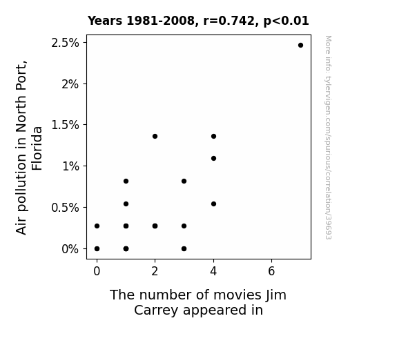 This means 55% of the change in the one variable (i.e., The number of movies Jim Carrey appeared in) is predictable based on the change in the other (i.e., Air pollution in North Port, Florida) over the 28 years from 1981 through 2008.