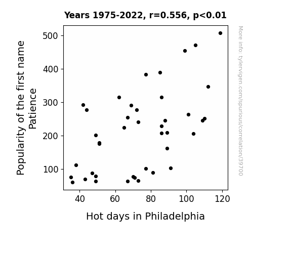 This means 30.9% of the change in the one variable (i.e., Hot days in Philadelphia) is predictable based on the change in the other (i.e., Popularity of the first name Patience) over the 41 years from 1975 through 2022.