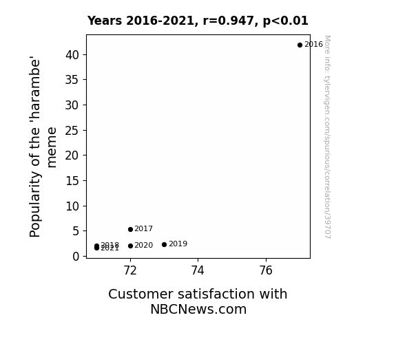 This means 89.7% of the change in the one variable (i.e., Customer satisfaction with NBCNews.com) is predictable based on the change in the other (i.e., Popularity of the 'harambe' meme) over the 6 years from 2016 through 2021.