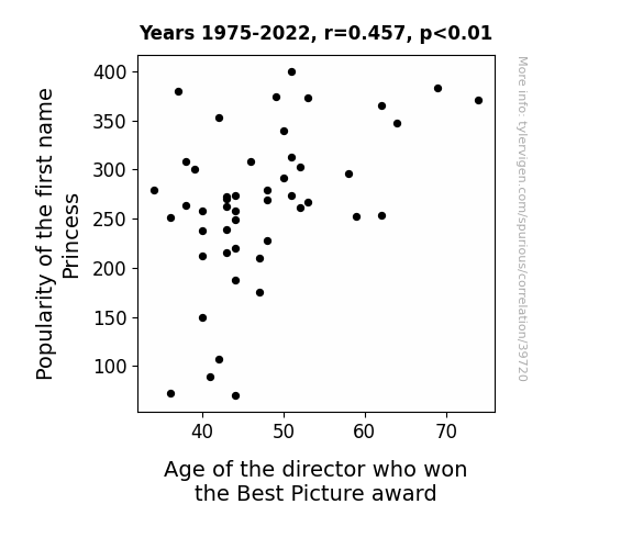 This means 20.9% of the change in the one variable (i.e., Age of the director who won the Best Picture award) is predictable based on the change in the other (i.e., Popularity of the first name Princess) over the 48 years from 1975 through 2022.