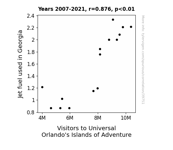 This means 76.8% of the change in the one variable (i.e., Visitors to Universal Orlando's Islands of Adventure) is predictable based on the change in the other (i.e., Jet fuel used in Georgia) over the 15 years from 2007 through 2021.