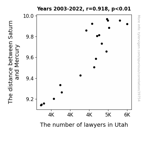 This means 84.2% of the change in the one variable (i.e., The number of lawyers in Utah) is predictable based on the change in the other (i.e., The distance between Saturn and Mercury) over the 20 years from 2003 through 2022.