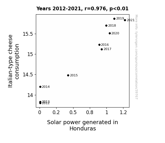 This means 95.3% of the change in the one variable (i.e., Solar power generated in Honduras) is predictable based on the change in the other (i.e., Italian-type cheese consumption) over the 10 years from 2012 through 2021.