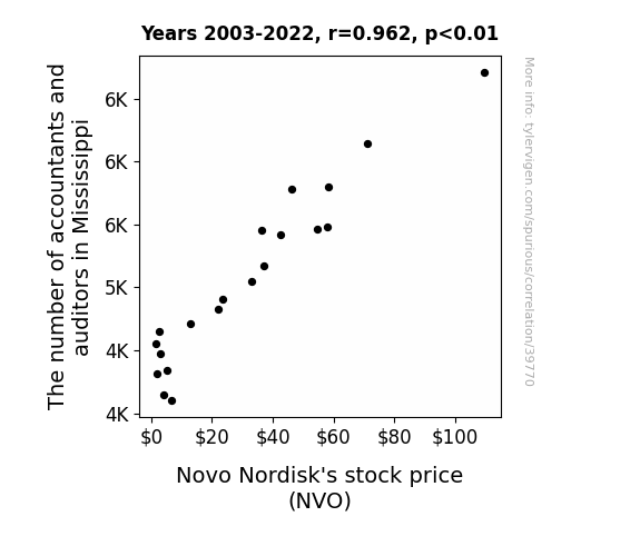 This means 92.5% of the change in the one variable (i.e., Novo Nordisk's stock price (NVO)) is predictable based on the change in the other (i.e., The number of accountants and auditors in Mississippi) over the 20 years from 2003 through 2022.
