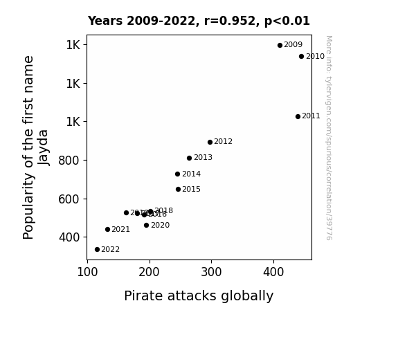 This means 90.6% of the change in the one variable (i.e., Pirate attacks globally) is predictable based on the change in the other (i.e., Popularity of the first name Jayda) over the 14 years from 2009 through 2022.
