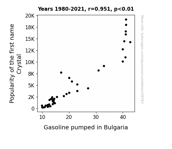 This means 90.5% of the change in the one variable (i.e., Gasoline pumped in Bulgaria) is predictable based on the change in the other (i.e., Popularity of the first name Crystal) over the 42 years from 1980 through 2021.