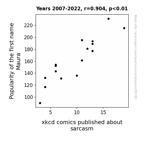 This means 81.8% of the change in the one variable (i.e., xkcd comics published about sarcasm) is predictable based on the change in the other (i.e., Popularity of the first name Maura) over the 16 years from 2007 through 2022.