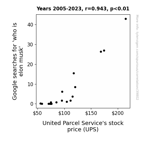 This means 88.9% of the change in the one variable (i.e., United Parcel Service's stock price (UPS)) is predictable based on the change in the other (i.e., Google searches for 'who is elon musk') over the 19 years from 2005 through 2023.