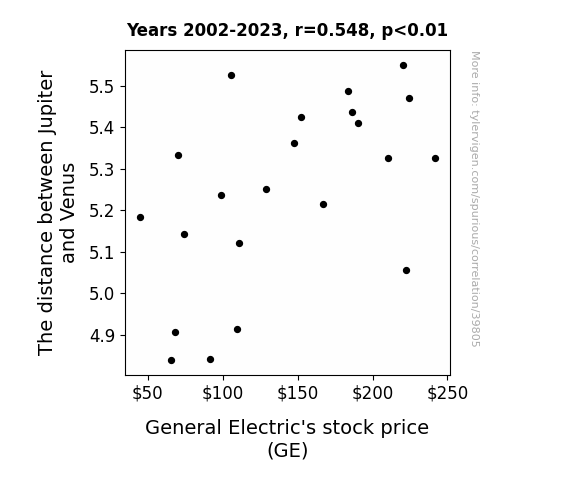 This means 30% of the change in the one variable (i.e., General Electric's stock price (GE)) is predictable based on the change in the other (i.e., The distance between Jupiter and Venus) over the 22 years from 2002 through 2023.