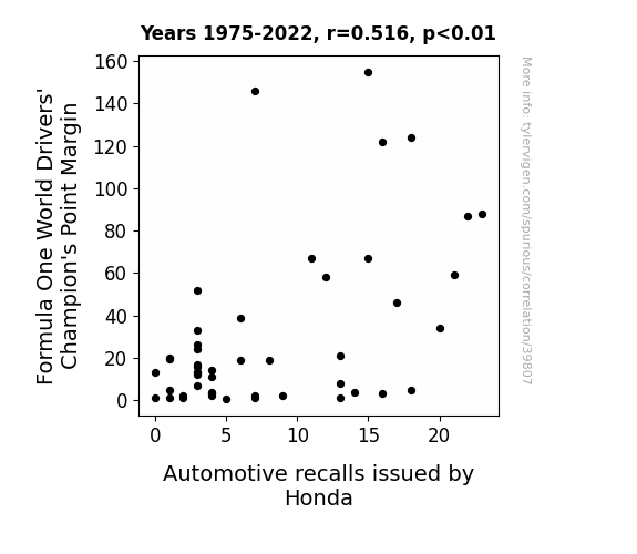 This means 26.6% of the change in the one variable (i.e., Automotive recalls issued by Honda) is predictable based on the change in the other (i.e., Formula One World Drivers' Champion's Point Margin) over the 48 years from 1975 through 2022.