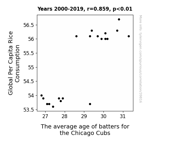 This means 73.8% of the change in the one variable (i.e., The average age of batters for the Chicago Cubs) is predictable based on the change in the other (i.e., Global Per Capita Rice Consumption) over the 20 years from 2000 through 2019.