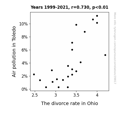 This means 53.3% of the change in the one variable (i.e., The divorce rate in Ohio) is predictable based on the change in the other (i.e., Air pollution in Toledo) over the 23 years from 1999 through 2021.