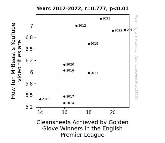 This means 60.3% of the change in the one variable (i.e., Cleansheets Achieved by Golden Glove Winners in the English Premier League) is predictable based on the change in the other (i.e., How fun MrBeast's YouTube video titles are) over the 11 years from 2012 through 2022.