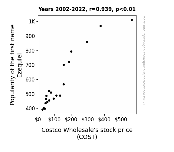 This means 88.2% of the change in the one variable (i.e., Costco Wholesale's stock price (COST)) is predictable based on the change in the other (i.e., Popularity of the first name Ezequiel) over the 21 years from 2002 through 2022.