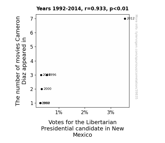 This means 87% of the change in the one variable (i.e., Votes for the Libertarian Presidential candidate in New Mexico) is predictable based on the change in the other (i.e., The number of movies Cameron Diaz appeared in) over the 6 years from 1992 through 2014.