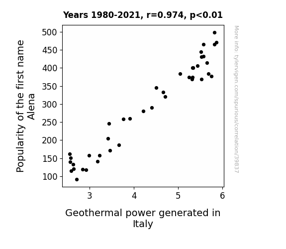 This means 95% of the change in the one variable (i.e., Geothermal power generated in Italy) is predictable based on the change in the other (i.e., Popularity of the first name Alena) over the 42 years from 1980 through 2021.