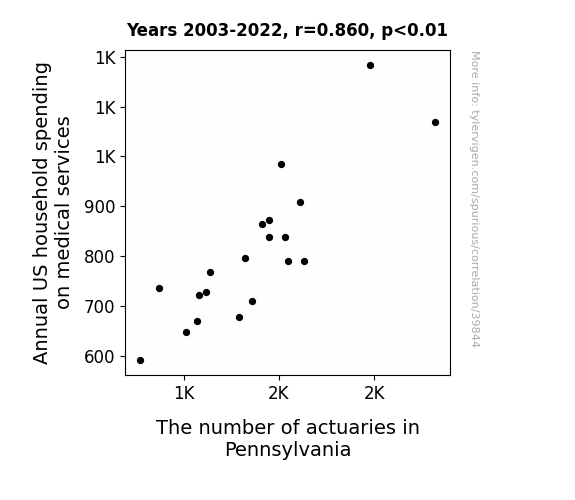 This means 74% of the change in the one variable (i.e., The number of actuaries in Pennsylvania) is predictable based on the change in the other (i.e., Annual US household spending on medical services) over the 20 years from 2003 through 2022.
