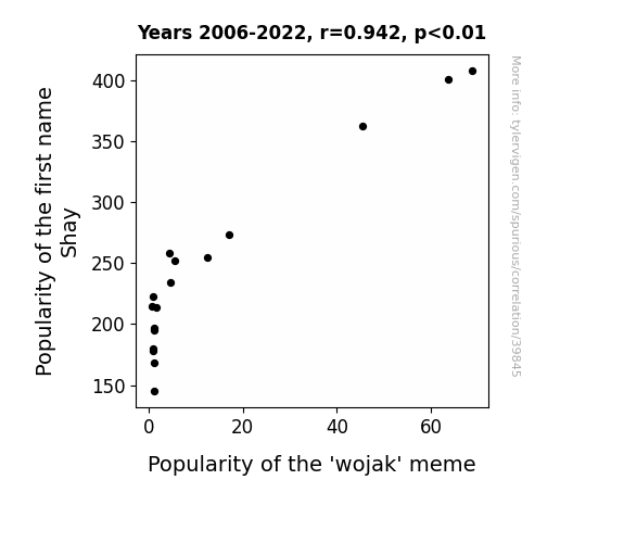 This means 88.8% of the change in the one variable (i.e., Popularity of the 'wojak' meme) is predictable based on the change in the other (i.e., Popularity of the first name Shay) over the 17 years from 2006 through 2022.