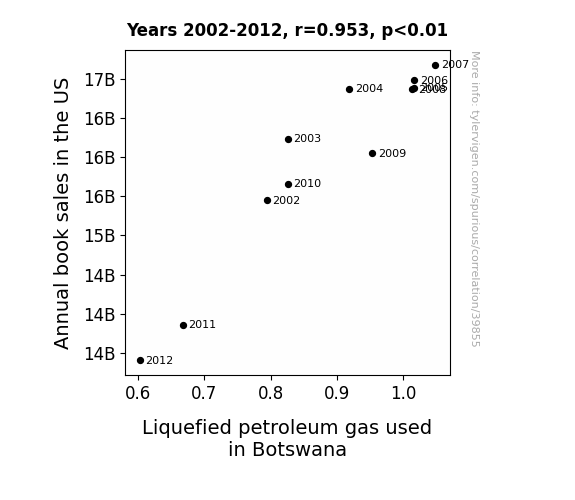 This means 90.9% of the change in the one variable (i.e., Liquefied petroleum gas used in Botswana) is predictable based on the change in the other (i.e., Annual book sales in the US) over the 11 years from 2002 through 2012.