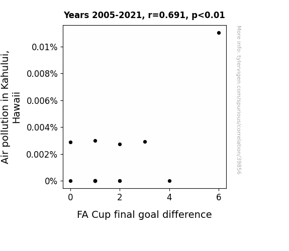 This means 47.7% of the change in the one variable (i.e., FA Cup final goal difference) is predictable based on the change in the other (i.e., Air pollution in Kahului, Hawaii) over the 17 years from 2005 through 2021.