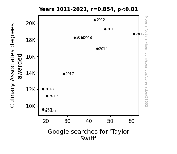 This means 73% of the change in the one variable (i.e., Google searches for 'Taylor Swift') is predictable based on the change in the other (i.e., Culinary Associates degrees awarded) over the 11 years from 2011 through 2021.