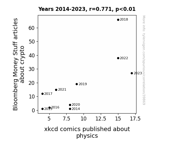 This means 59.4% of the change in the one variable (i.e., xkcd comics published about physics) is predictable based on the change in the other (i.e., Bloomberg Money Stuff articles about crypto) over the 10 years from 2014 through 2023.