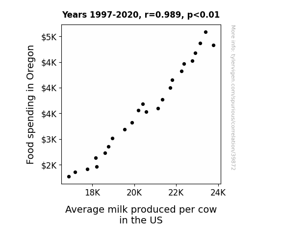 This means 97.9% of the change in the one variable (i.e., Average milk produced per cow in the US) is predictable based on the change in the other (i.e., Food spending in Oregon) over the 24 years from 1997 through 2020.