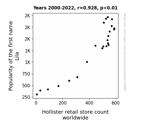 This means 86.2% of the change in the one variable (i.e., Hollister retail store count worldwide) is predictable based on the change in the other (i.e., Popularity of the first name Lila) over the 23 years from 2000 through 2022.
