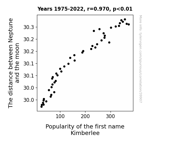 This means 94.1% of the change in the one variable (i.e., Popularity of the first name Kimberlee) is predictable based on the change in the other (i.e., The distance between Neptune and the moon) over the 48 years from 1975 through 2022.
