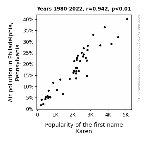 This means 88.8% of the change in the one variable (i.e., Popularity of the first name Karen) is predictable based on the change in the other (i.e., Air pollution in Philadelphia, Pennsylvania) over the 43 years from 1980 through 2022.